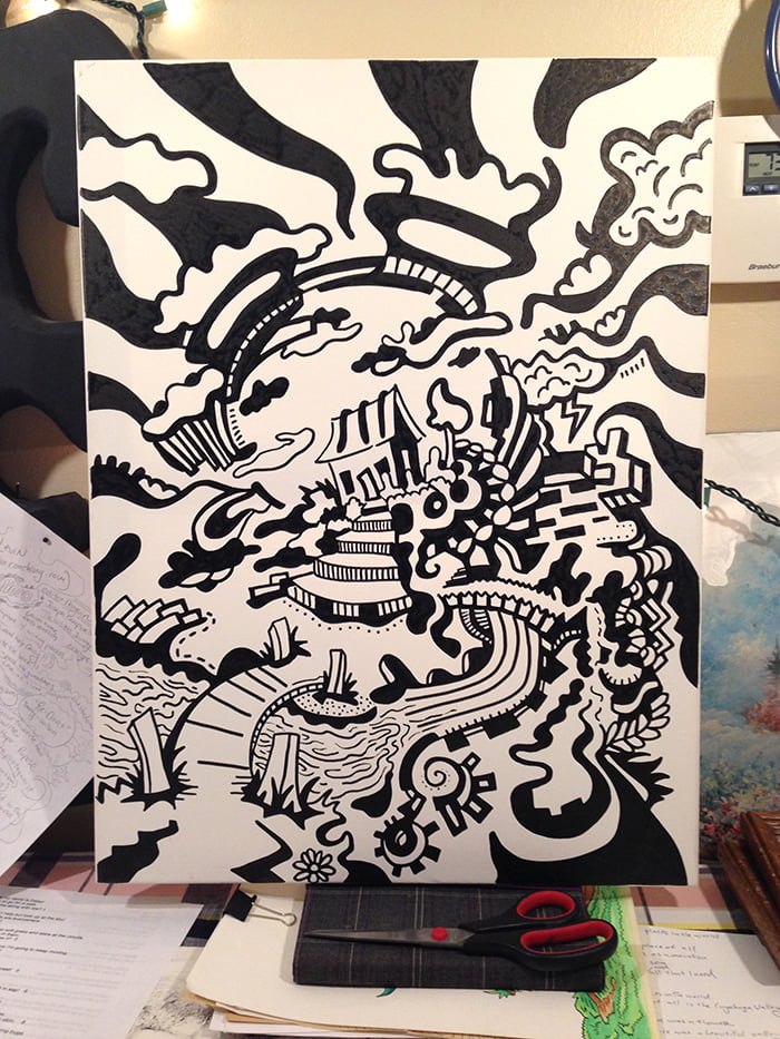 Hearing a diagnosis I knew nothing about was heartbreaking. My identity at that time was all about health…[I was] completely shattered and confused about how to move forward. The shades and textures of blue indicate layers of sadness. The number of hearts shows this affected major areas of my life. The hearts falling symbolizes observing my confidence in capability of doing things changing.