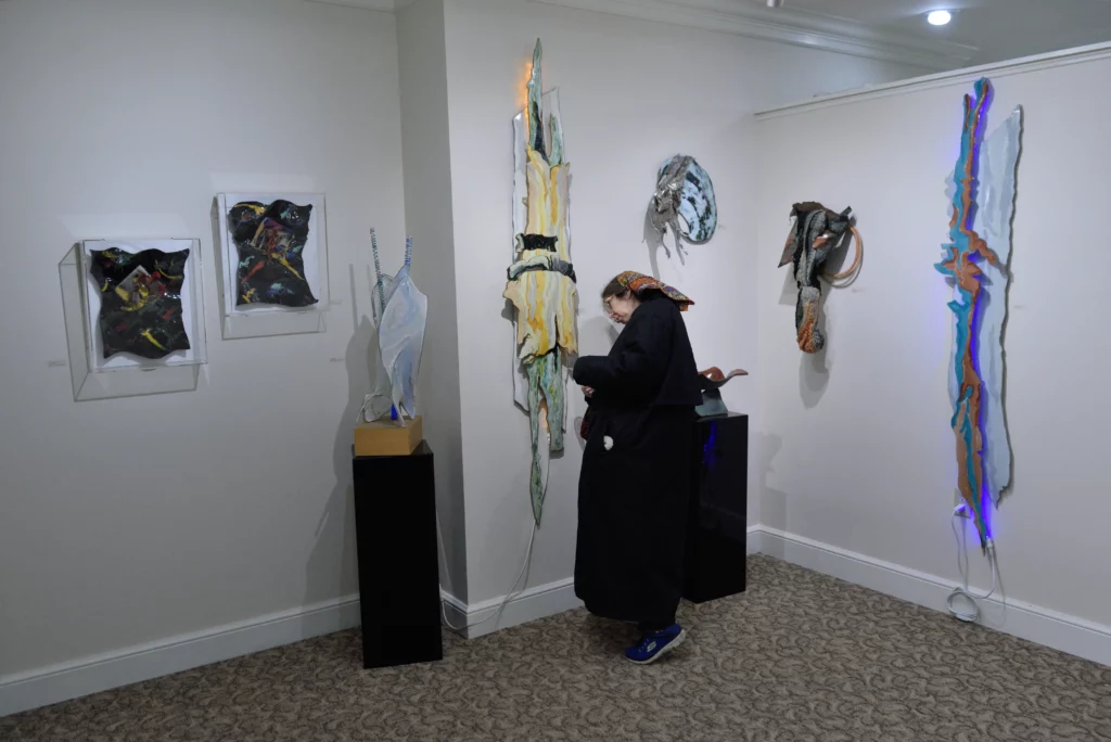 Carol’s work is always organic, textured and dimensional. It speaks to the beauty of the world and the magic of complex shapes and materials. She is somewhat eclectic and works in a number of different series simultaneously and considers any media to be painting or sculpture and uses it accordingly. Over time, she moved from highly textured painting to fiber, enamel, and light as her most prevalent media, with the incorporation of many other media. Her larger work is installations where the viewer is inside the work. She thinks of these smaller works as sketches for the larger. For many years Carol was the designer for a laser light company where the lines could reach out across acres. To her, it is all highly environmental.
