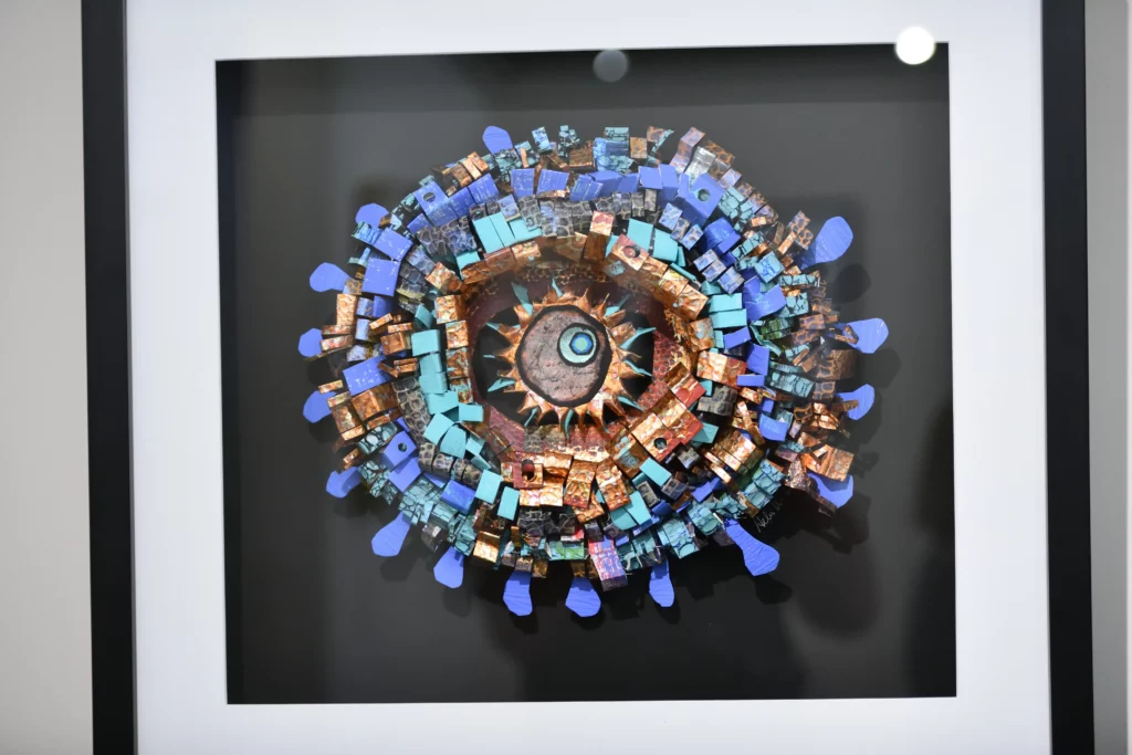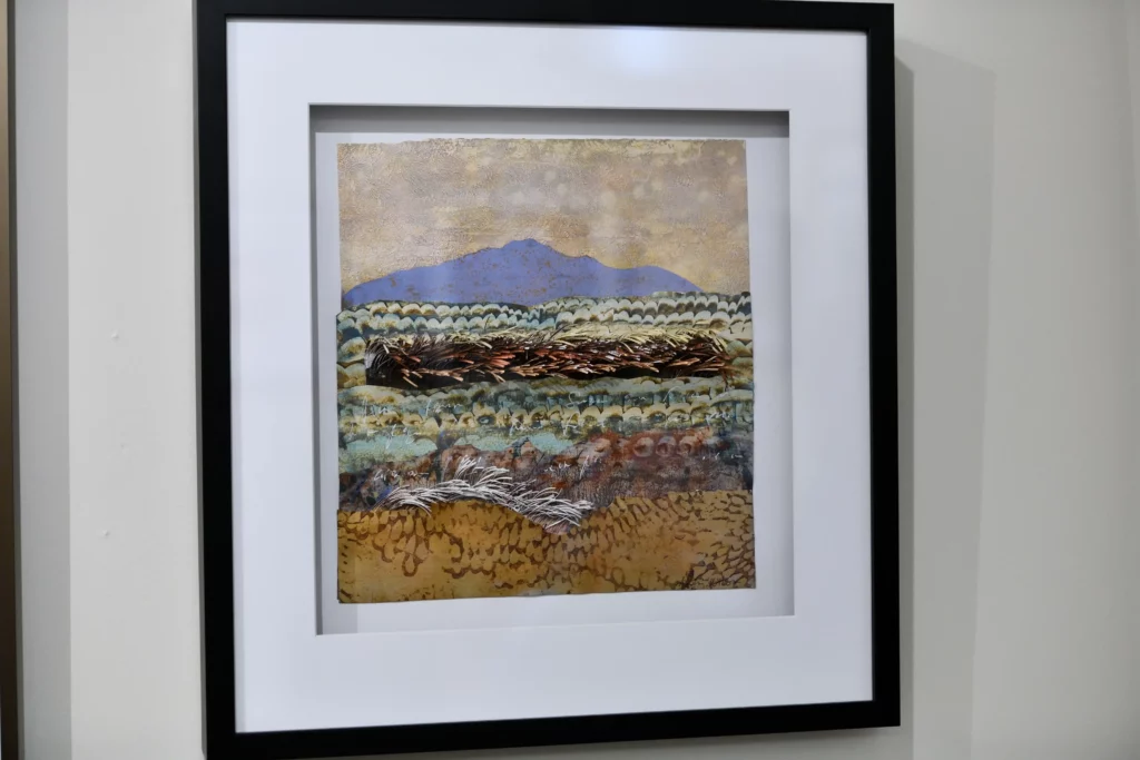 Also, I have come to consider that the botanical world has a message for us. There is more to life than meets the eye! Over several years, I tried many different artistic approaches and finally discovered my voice in the mixed media collage process. I actually devised my own process of 3-D paper collage, also considered as a low relief sculpture. I use acrylic paints, mediums, inks, mono-printing and the metal gilding process in my work. I also include asemic writing and numbers in many of my works as a means of giving voice to the botanical world. Recently, I have begun to use my process to create free standing paper assemblages.