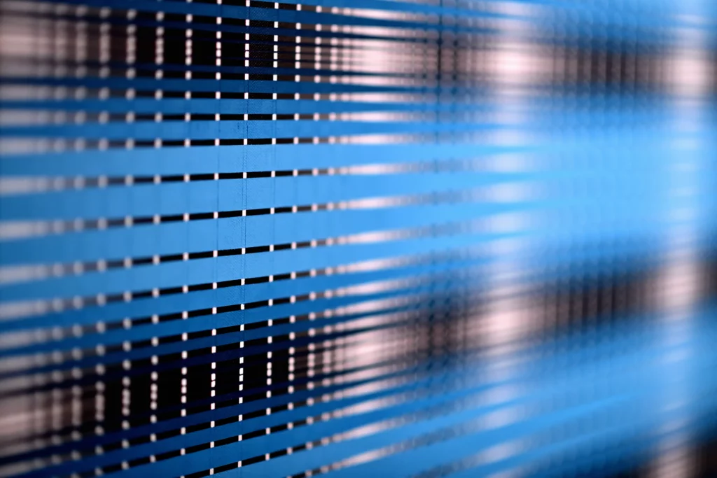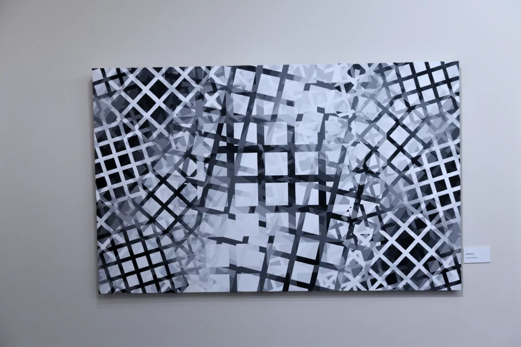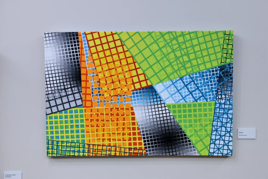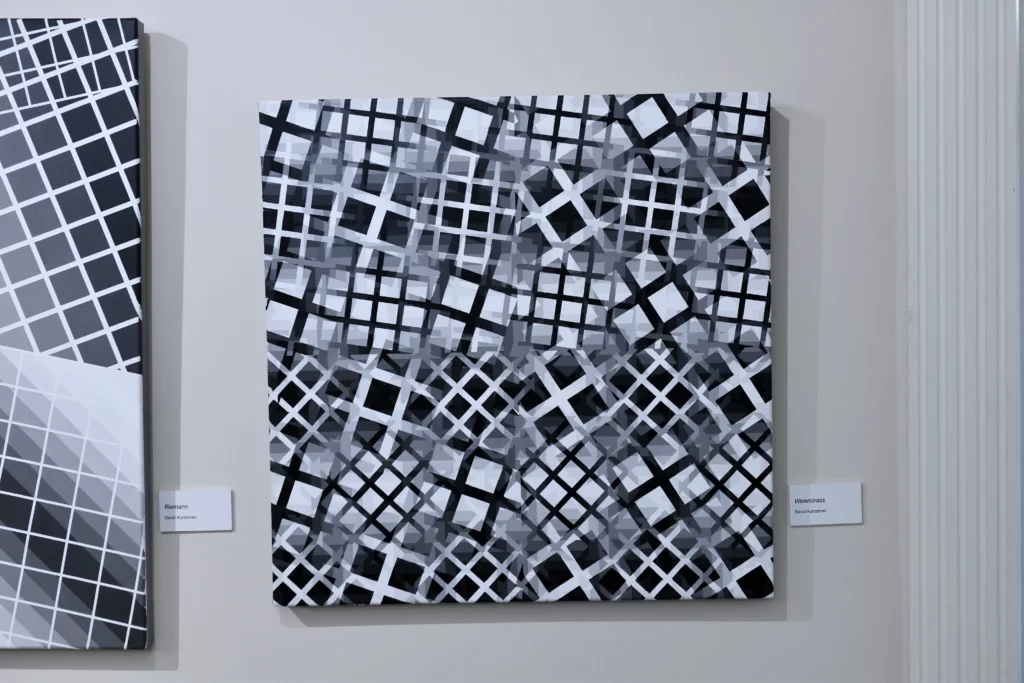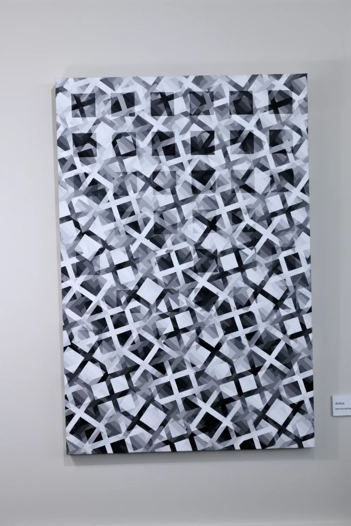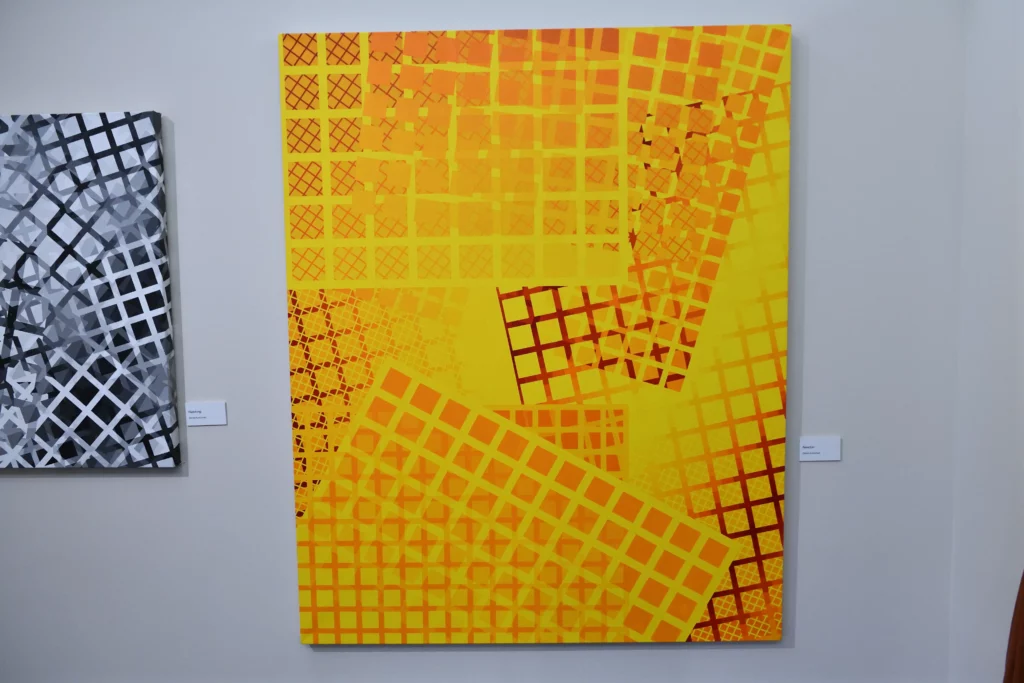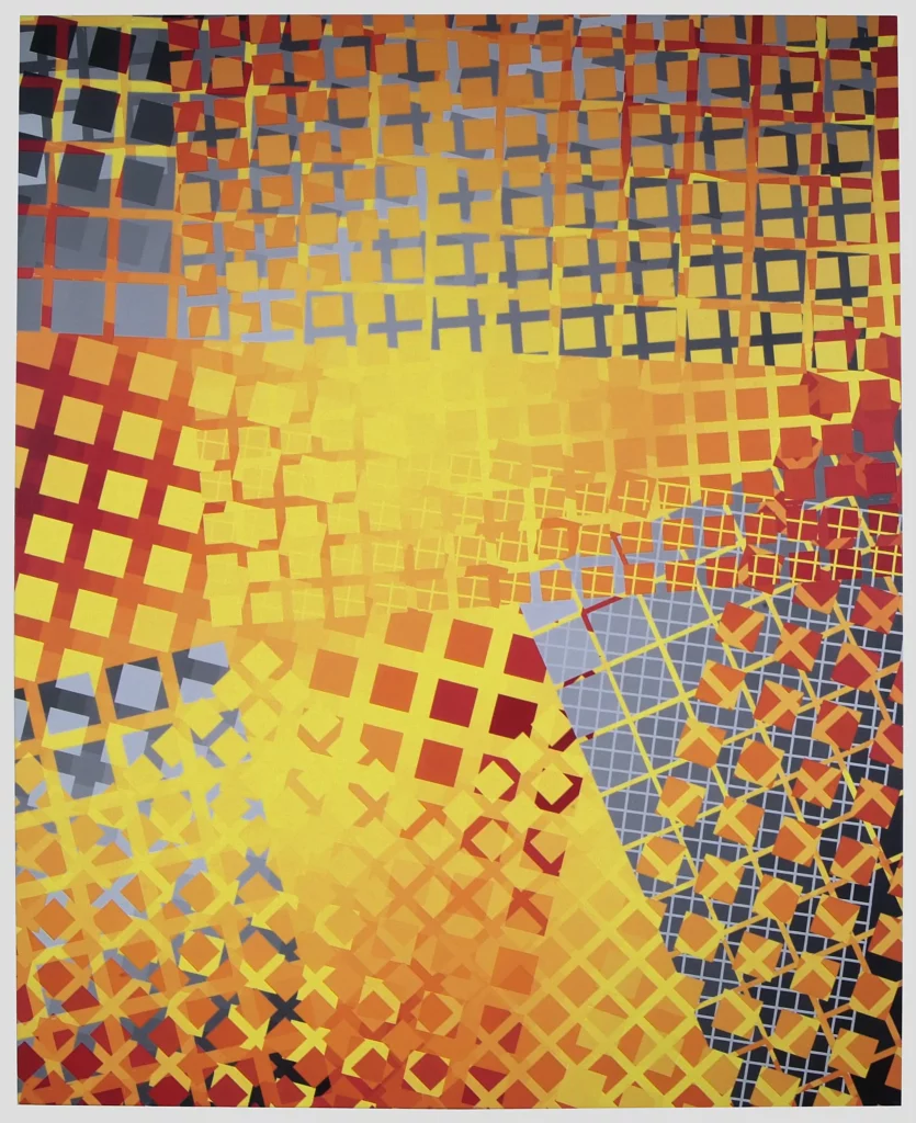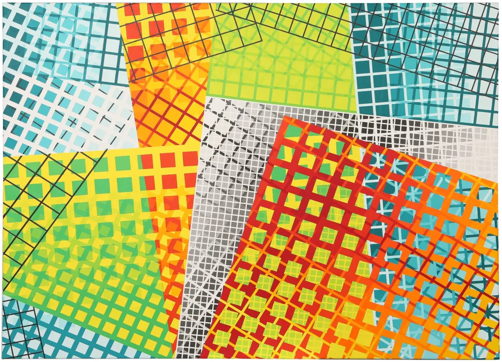 At present, in addition to the “Op” artists, my influences now include Frank Stella (specifically the “plane” paintings of the early to mid-1970’s) and Liubov Popova of the “Constructivist” movement. As such, my artworks have evolved into presentations of various grid comparisons, such as grids of different sizes, angles, and colors. The color progressions are now being used to present the contrasting gridworks creating a dense and ambiguous space.