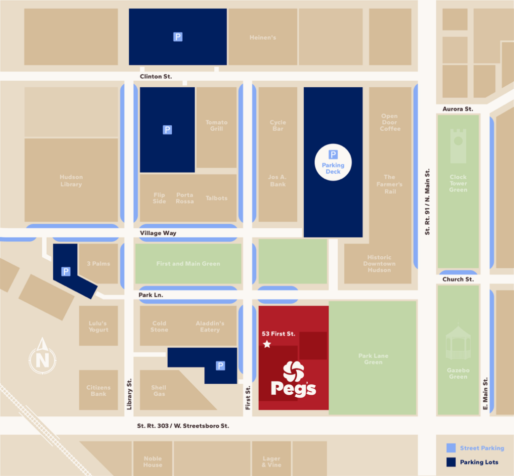 Peg’s Gallery is located in downtown Hudson in the First & Main District near the corner of State Route 303 and State Route 91.